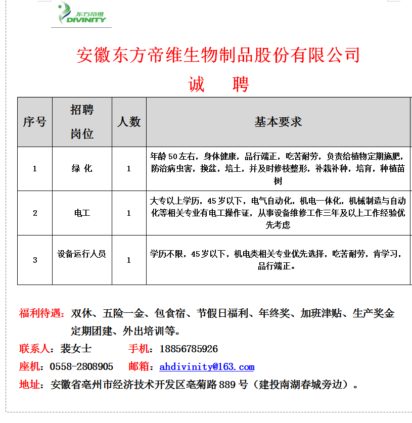 安徽東方帝維生物制品招聘